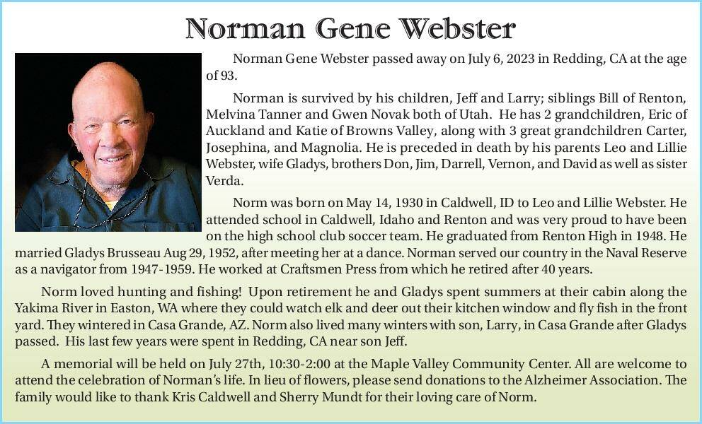 Norman Gene Webster passed away on July 6, 2023 in Redding, CA at the age of 93.