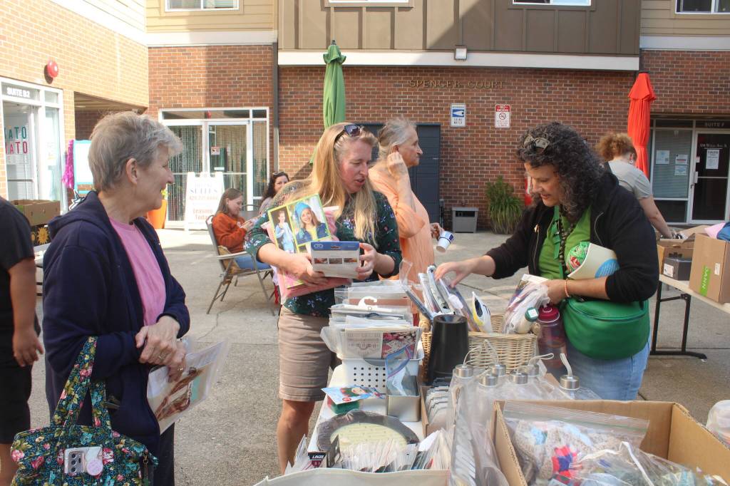 Kelly Affleck welcomed crafting experts and novices alike to the courtyard outside Tomāto Tomäto Creative Space on Wells Avenue, where tables filled with free crafting supplies — from sewing patterns of 1970s jumpsuits to rubber teaching stamps to a box full of shoelaces — were looked over and creative ideas were sparked. Along with the swap meet, Tomāto Tomäto offered tables to work on needlepoint and the chance to create custom magnets for $5, and of course, free snacks and beverages. “I’m Italian, so I always have to provide something to eat,” Affleck said with a laugh.