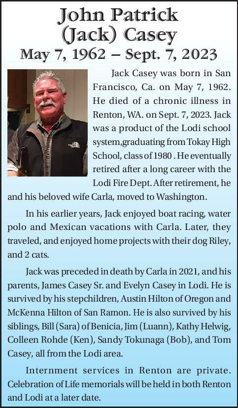 Jack Casey was born in San Francisco, Ca. on May 7, 1962. He died of a chronic illness in Renton, WA. on Sept. 7, 2023. Jack was a product of the Lodi school system,graduating from Tokay High School, class of 1980 . He eventually retired after a long career with the Lodi Fire Dept. After retirement, he and his beloved wife Carla, moved to Washington.