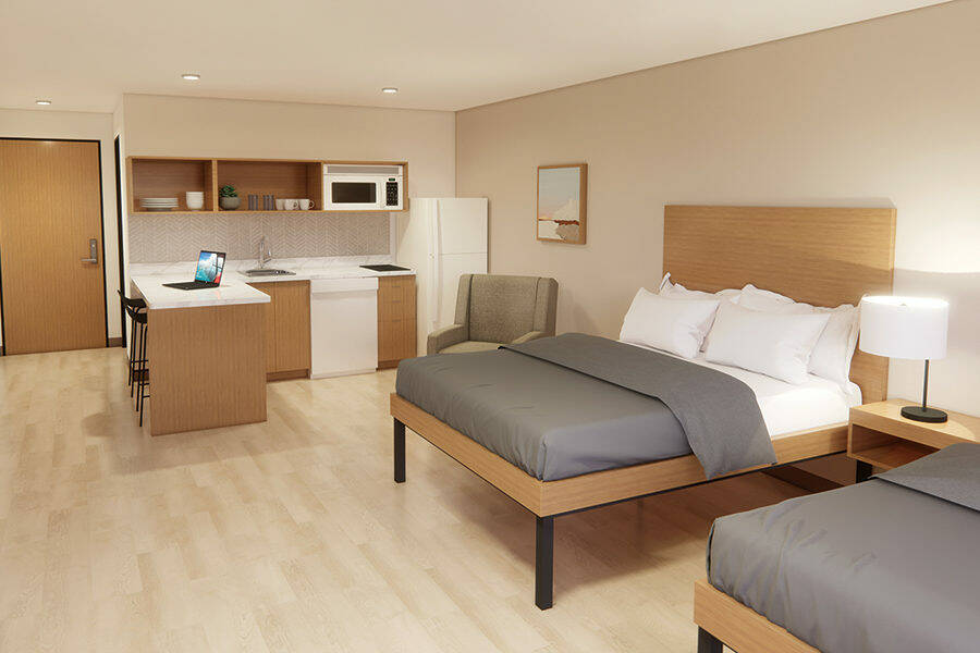 Designed as a more economical solution for guests needing long-term lodgings and hospitality, LivAway Suites come with in-room kitchens, an on-site fitness center, pet-friendly rooms, laundry facilities and community spaces.