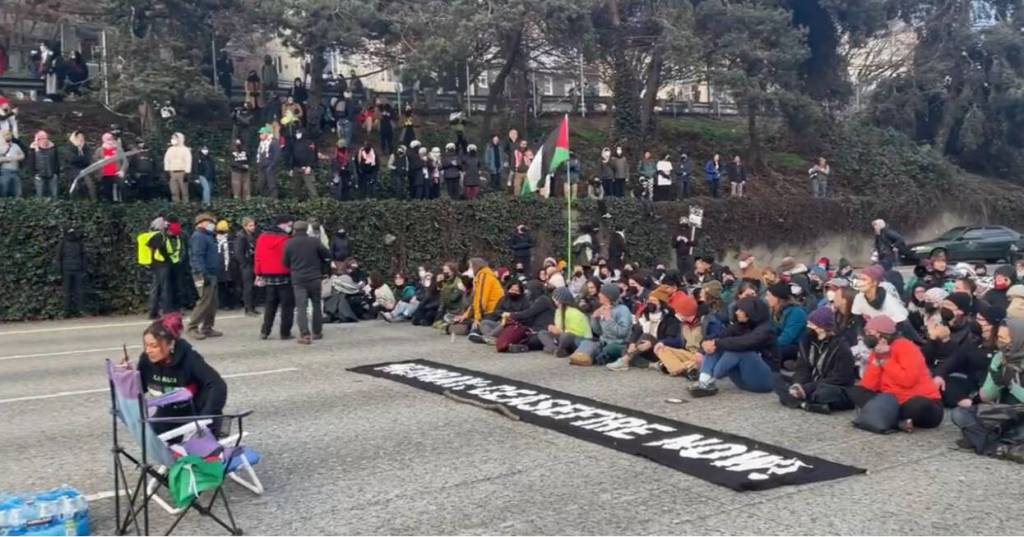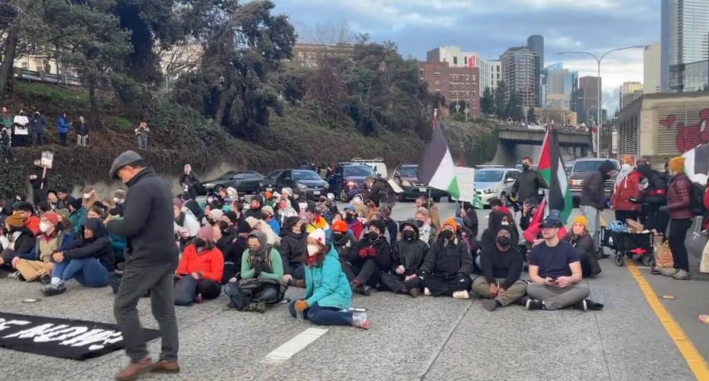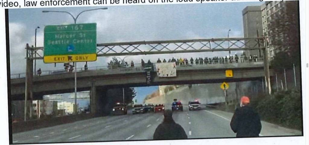 According to Washington State Patrol investigation documents, approximately 100 protesters accessed northbound Interstate 5 in Seattle using an on-ramp from Olive Street, blocking the freeway for multiple hours.