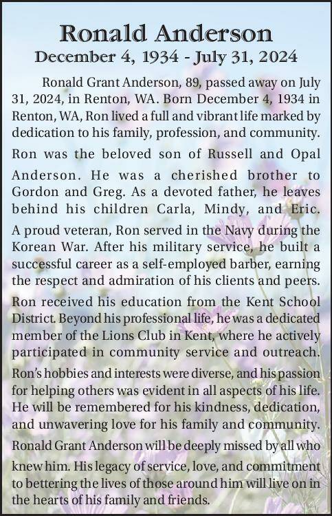 Ronald Grant Anderson, 89, passed away on July 31, 2024, in Renton, WA. Born December 4, 1934 in Renton, WA, Ron lived a full and vibrant life marked by dedication to his family, profession, and community.