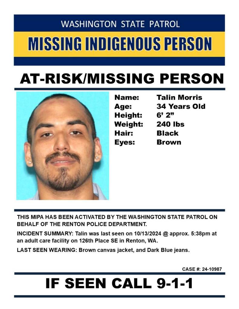 According to the Washington State Patrol, the agency activated a missing indigenous person alert for Morris at the request of the Renton Police Department on Oct. 23, ten days following Morris’s last sighting.