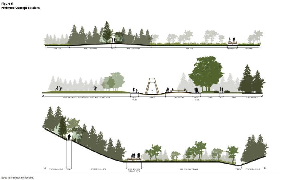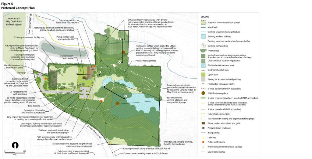 The plan said the paths and trails will have diverse landscapes and habitat areas, including forested slopes, wetlands, and scenic viewpoints of May Creek. If more land is acquired, additional amenities, such as sports courts, an off-leash dog area, and environmental education opportunities could be made, according to the plan.