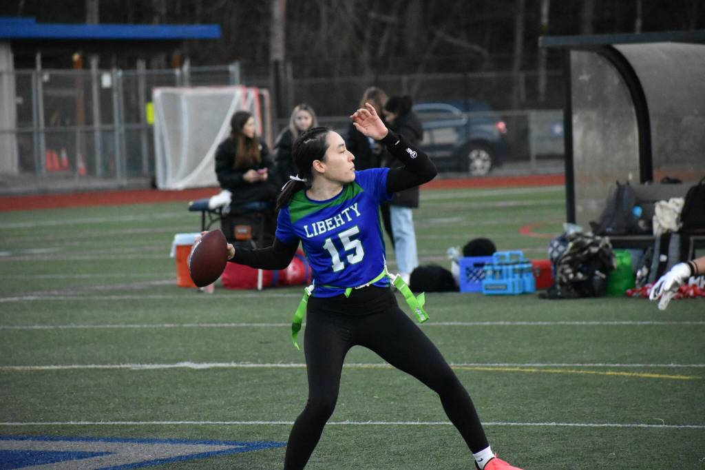 In the first season of girls flag football, the Liberty Patriots advanced to the KingCo Tournament with a record of 9-6.
