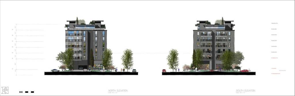 The development will have a footprint of 18,868 square feet and a max height above grade of 91.5 feet. Two separate level garages will contain 104 parking stalls for residents and guests. An additional surface parking lot will have 17 spots for the retail space.