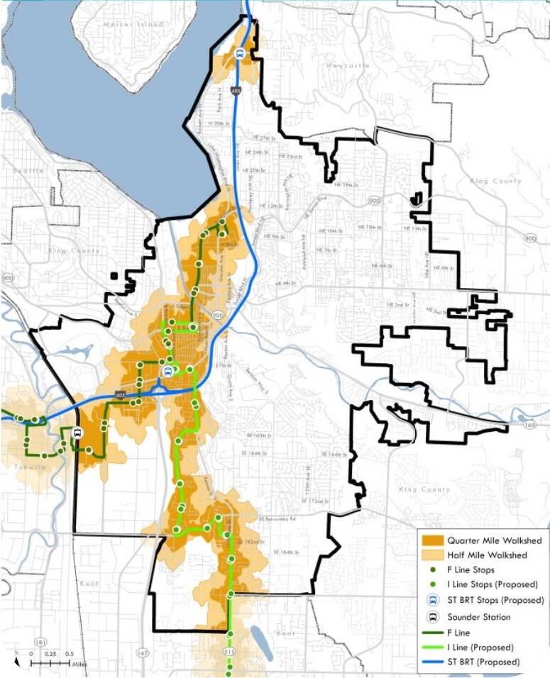 HB 1110 also established restrictions on the amount of parking a city can require and precludes cities from requiring off-street parking as a condition of approval when located within a half a mile walking distance from a major transit stop. Qualifying transit routes in Renton include King County RapidRide F line, future Sound Transit Stride and future King County RapidRide I line.