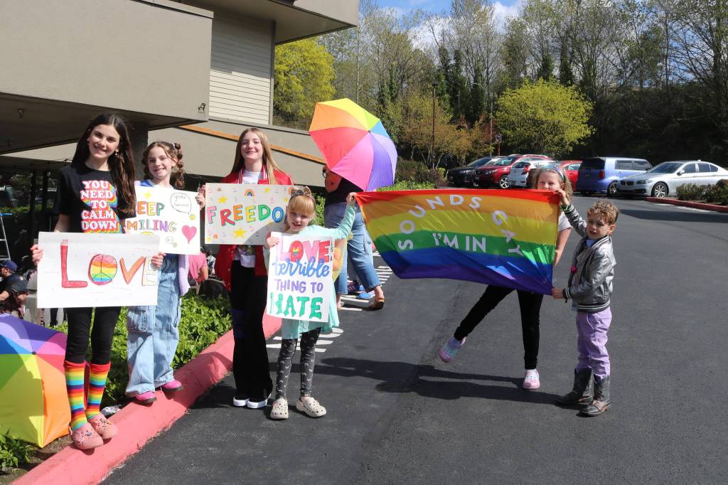It was all sunshine, rainbow flags, loud dance music and positive signs on April 12 in the parking lot outside The Brewmaster’s Taproom in Renton.
