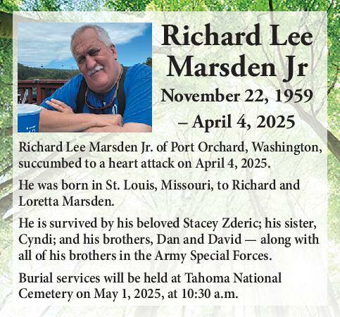 Richard Lee Marsden Jr. of Port Orchard, Washington, succumbed to a heart attack on April 4, 2025.