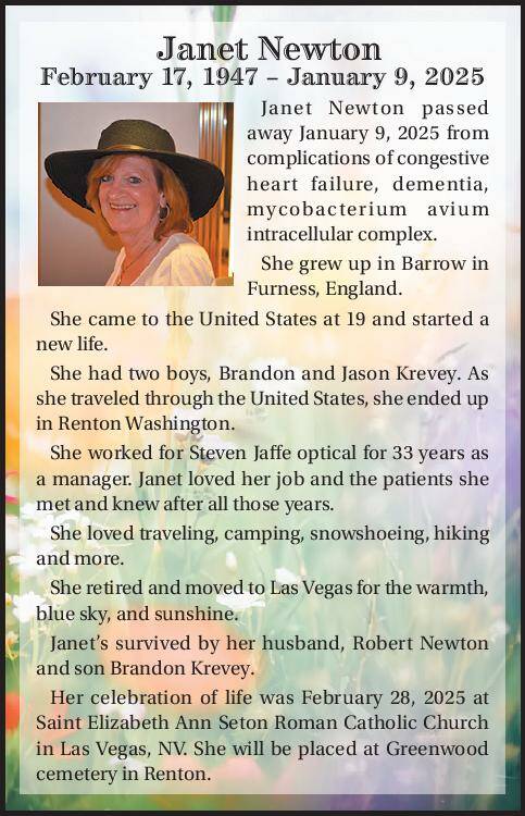 Janet Newton passed away January 9, 2025 from complications of congestive heart failure, dementia, mycobacterium avium intracellular complex.
