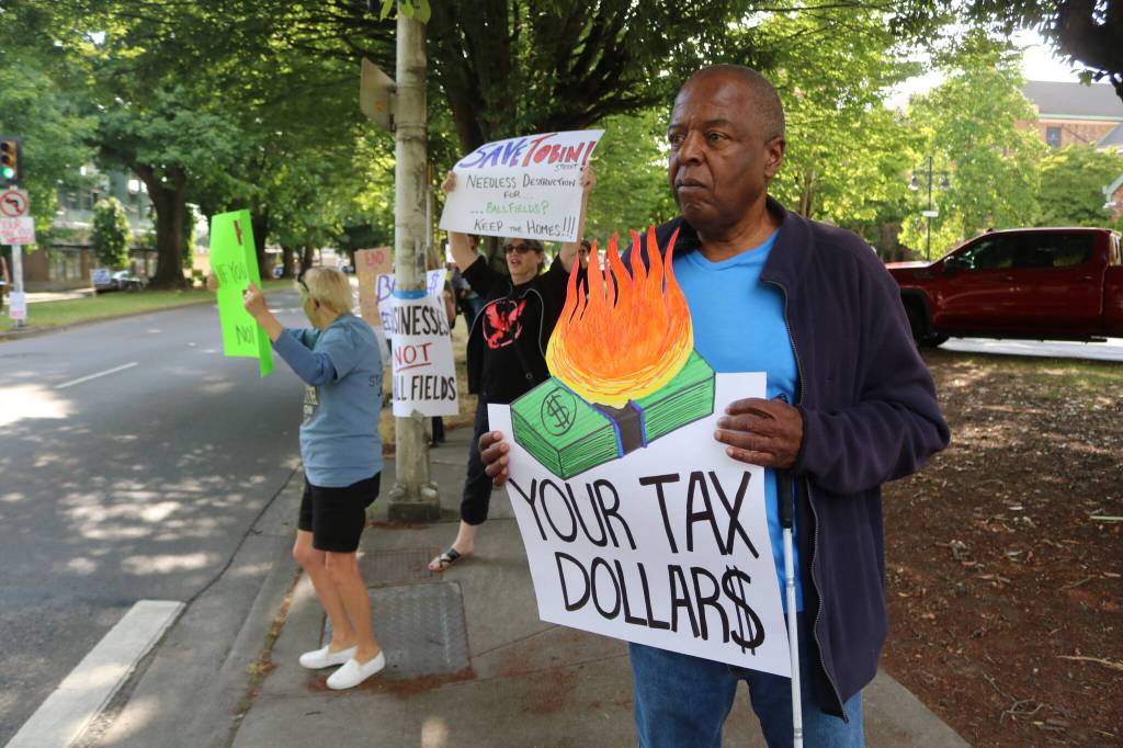 The protest included local community leaders like For A Better Renton president Sheryl Friesz and former Renton City Councilmember Marcie Palmer, who said that the issue of eminent domain had brought her to South 2nd Street that day.