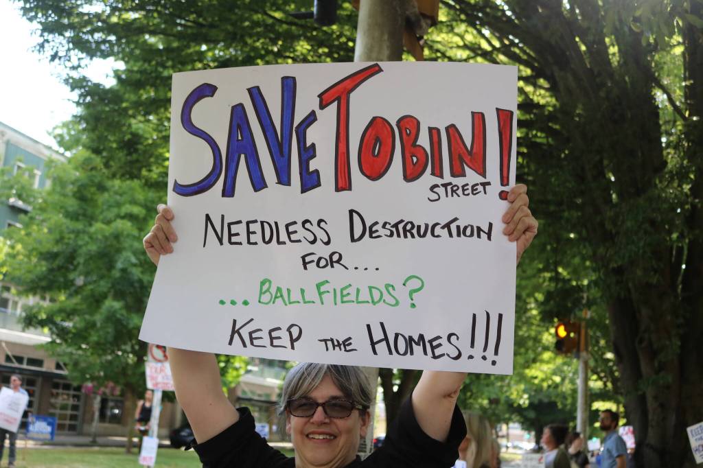 Over 30 protesters were present, carrying signs that read, “Honk if you support people not parking lots,” “Stop the Waste RSD” and “Save Catherine’s home!!!” One protester named Angie Laulainen said that she was there to support her friend Catherine Ploue-Smith.