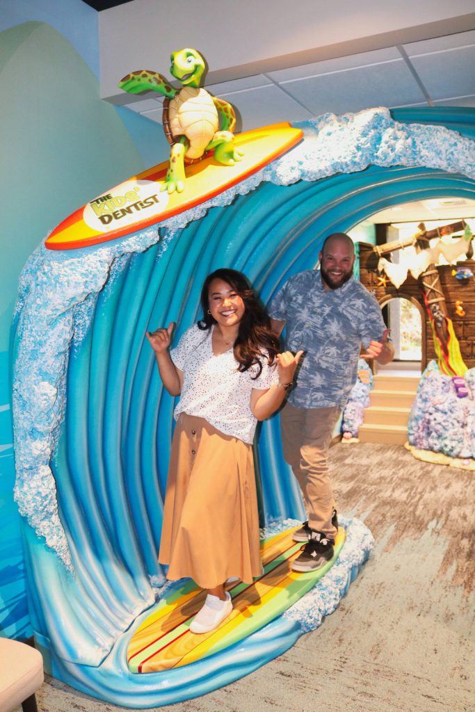 A beachy, nautical theme complete with Disney-inspired sea animals everywhere, a theme-park level surfboard and ship to play on, and even an interactive screen to play simple, fun games turns what’s traditionally a scary dentist appointment into something inviting and kid-friendly — and this is just the lobby.