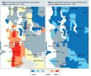 These maps show the percentage of uninsured King County residents at the present time and the estimates for after the Affordable Care Act goes into effect.