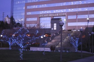 Blue lights in front of Renton City Hall honor slain Lakewood officers