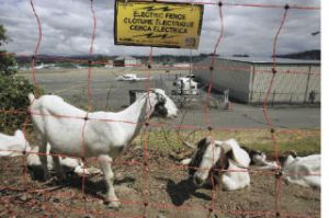 An electric fence pens in about 100 goats eating blackberry brambles and other vegetation alongside the Renton Municipal Airport Friday. They’ll be at work until Thursday or Friday.