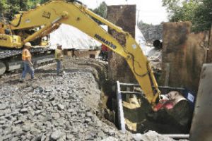 Some work has resumed on a multi-million project to replace a culvert under Interstate 405 in Renton that collapsed in the December rainstorm. Crews working for the state Department of Transportation are digging a big hole for what’s known as a “stilling basin” next to Main Avenue/Benson Road just south of Renton City Hall. The basin will act to dissipate the energy of the water as it passes through the culvert under I-405