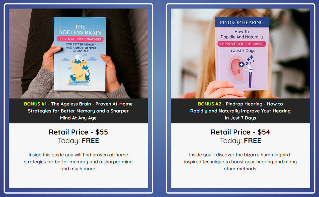 For a limited time only, EyeFortin offers two bonuses if you decide to purchase a three or six bottle package. These bonuses will further help improve your hearing, cognition, and overall health.
