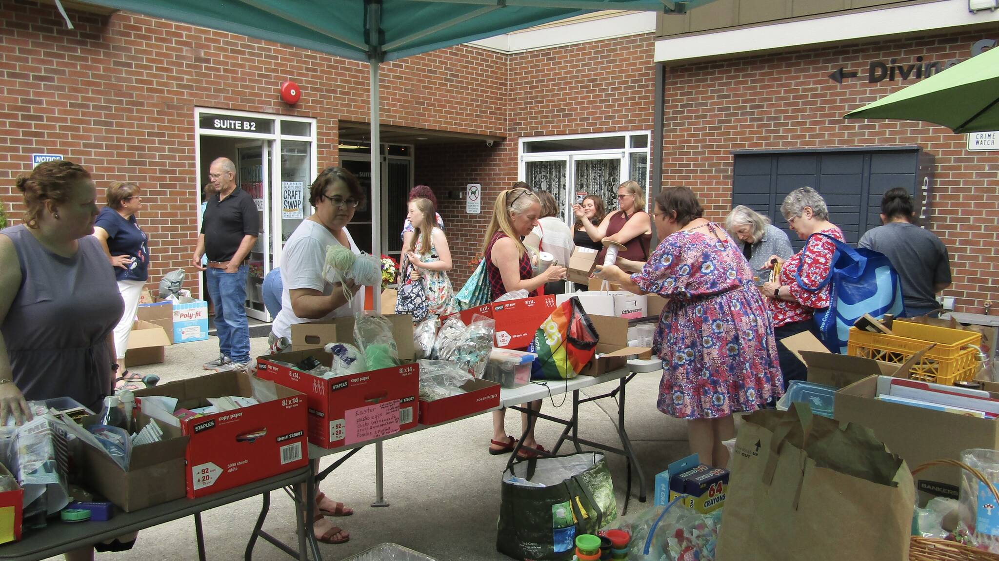 Residents of the complex above Tomāto Tomäto, along with art class-goers and people passing by, stopped by the free craft swap on July 21 where anyone could donate to or take from. Tables inside and outside the store were full of fabrics, cross stitch kits, paints, old puzzles, yarn, and much more.