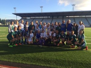 The Hazen and Evergreen soccer teams pose for a photo after the Highlanders offered green ribbons to the Wolverines as a show of support.