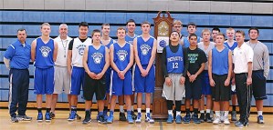The Liberty High School boys basketball team stands near a grandfather clock to mark when their Midnight Madness practice started.