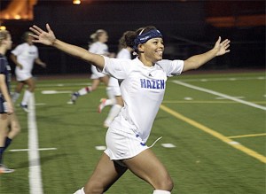 Hazen's Dee Dee Green celebrates after scoring a goal against Kennedy Catholic Oct. 20.