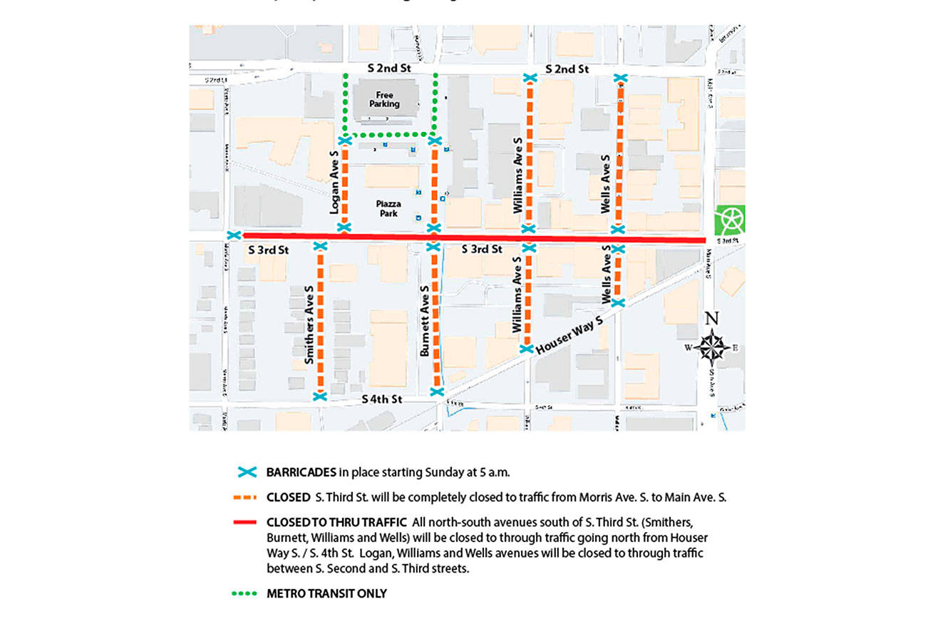 - All north-south avenues south of South Third Street (Smithers, Burnett, Williams and Wells) will be closed to through traffic northbound from Houser Way South.