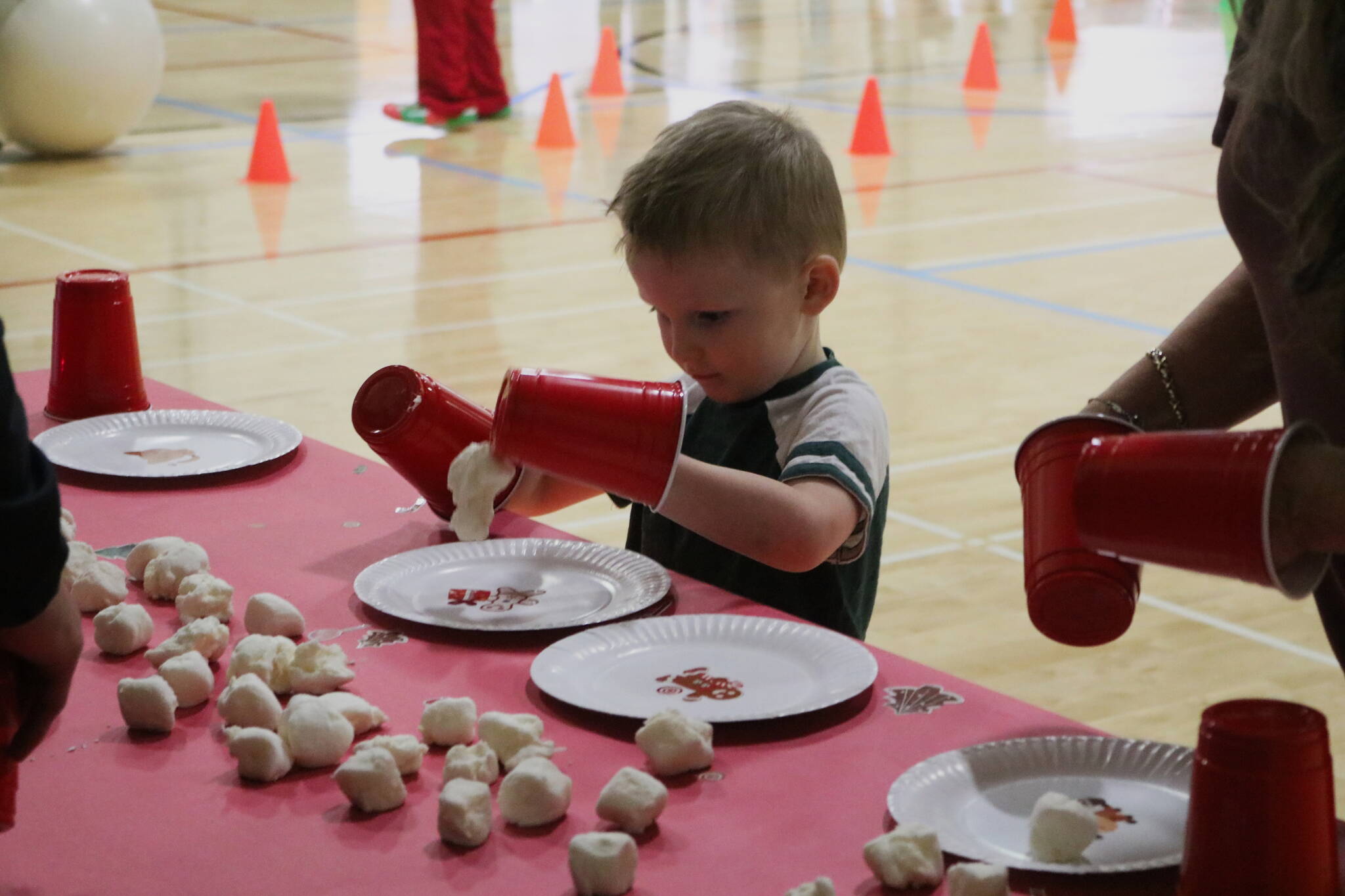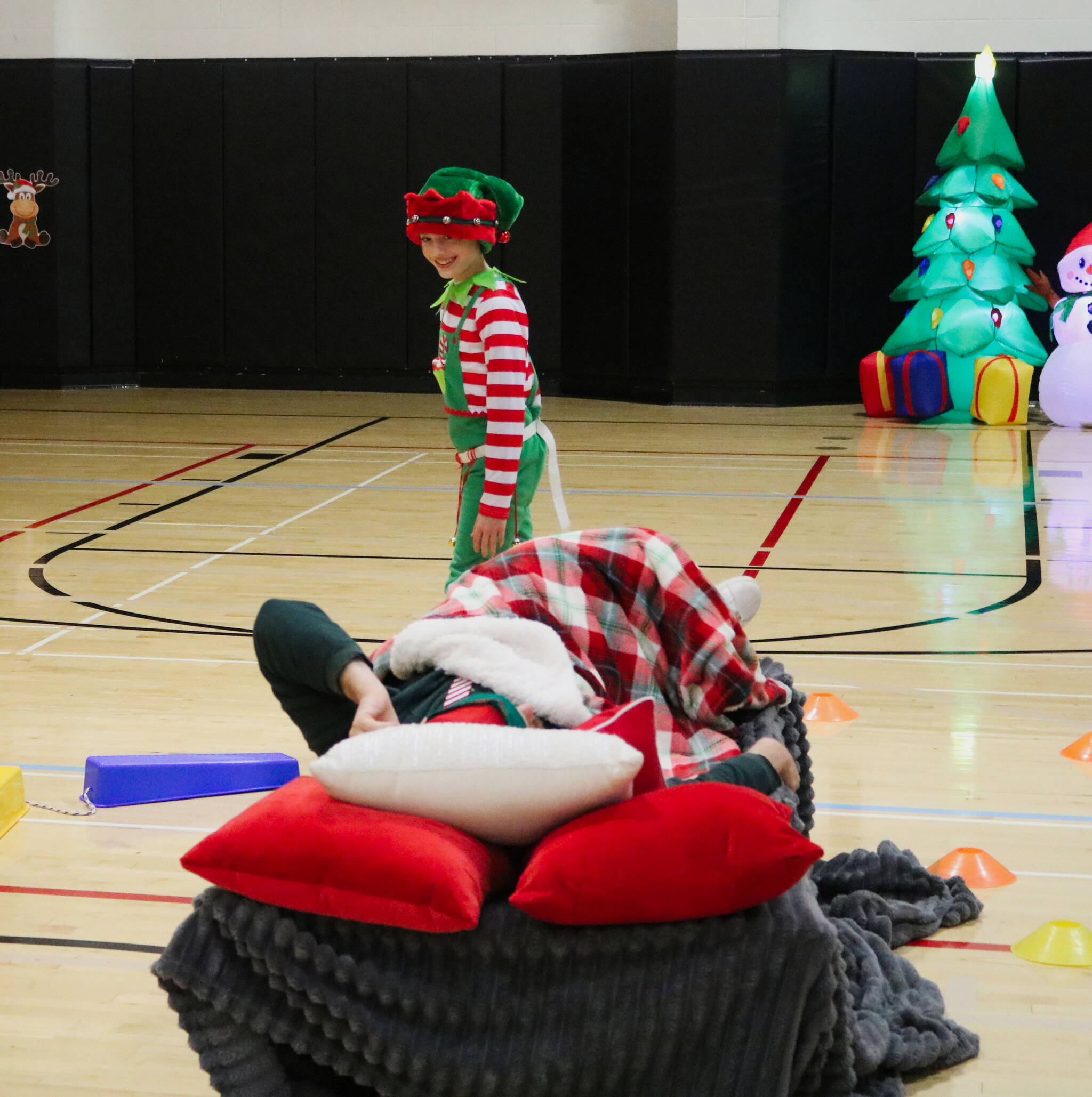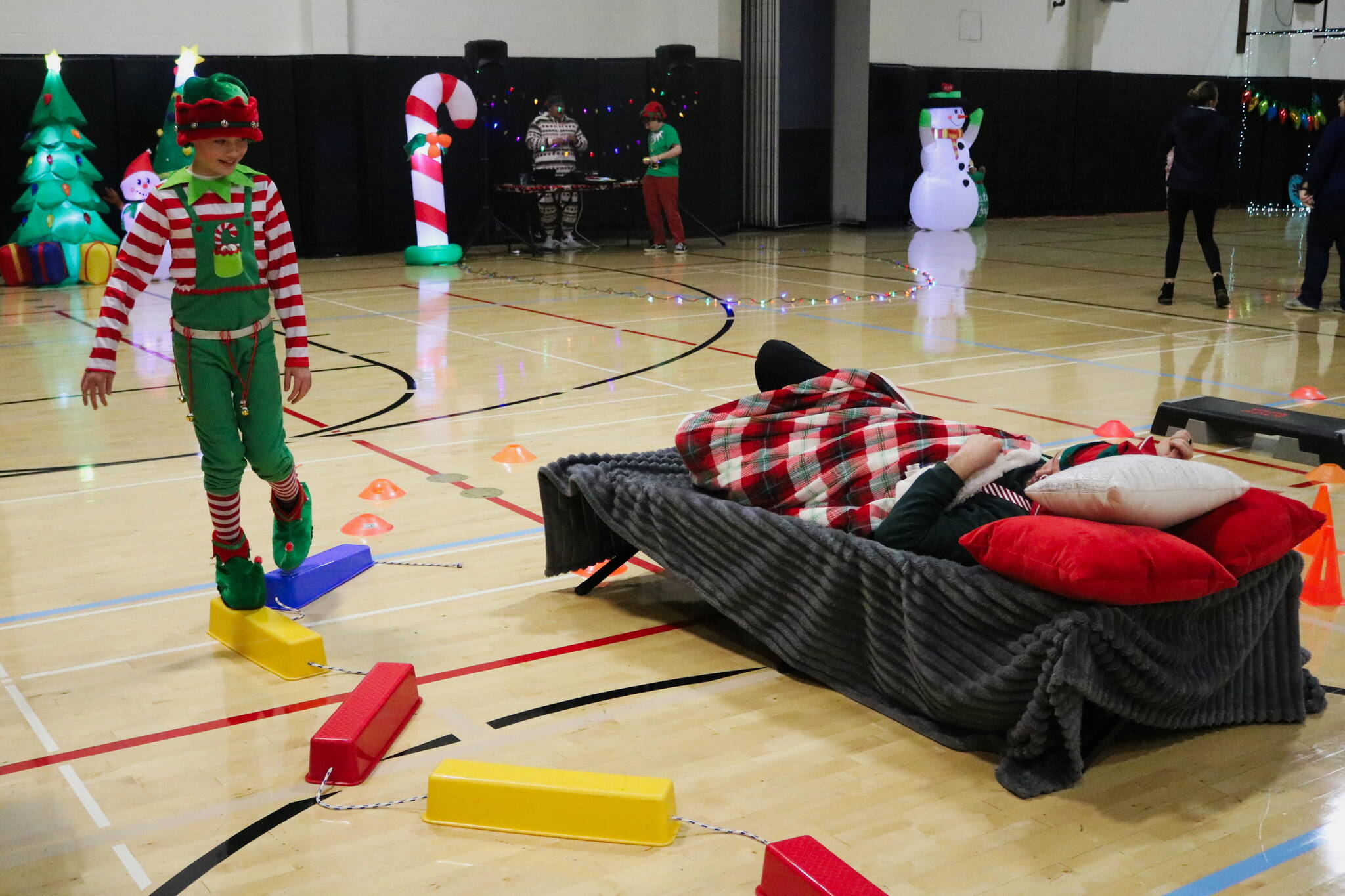 Different stations included a craft station, a giant snowball roll, pin-the-nose-on-the-reindeer, bow pickup, freeze dance, snowball free-throw, and the most difficult station, which tested the elf cadets’ stealthiness: Don’t Wake the Elf. With a sleepy head elf tucked into bed, the cadets have bells attached to their waists, and they must go through a small obstacle course without making a sound.