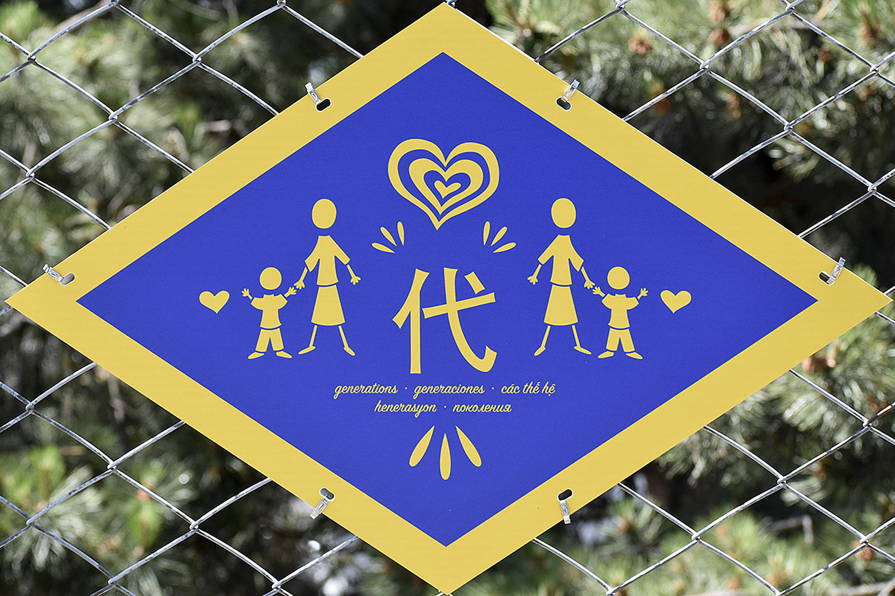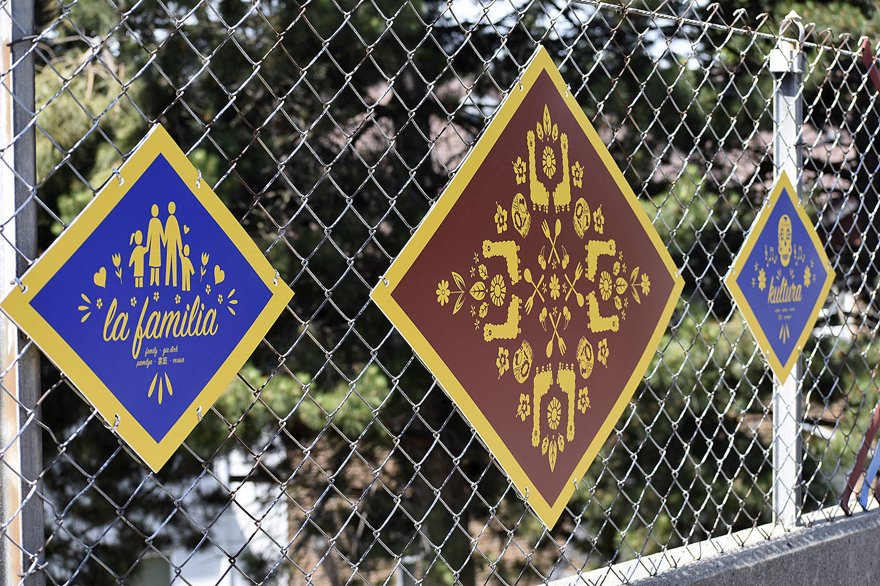 The chain-link fence along Northeast Sunset Boulevard has new messages for drivers-by: “Dúc tin” “La familia” “History” “代” “Komunidad” and “добро пожаловать.”