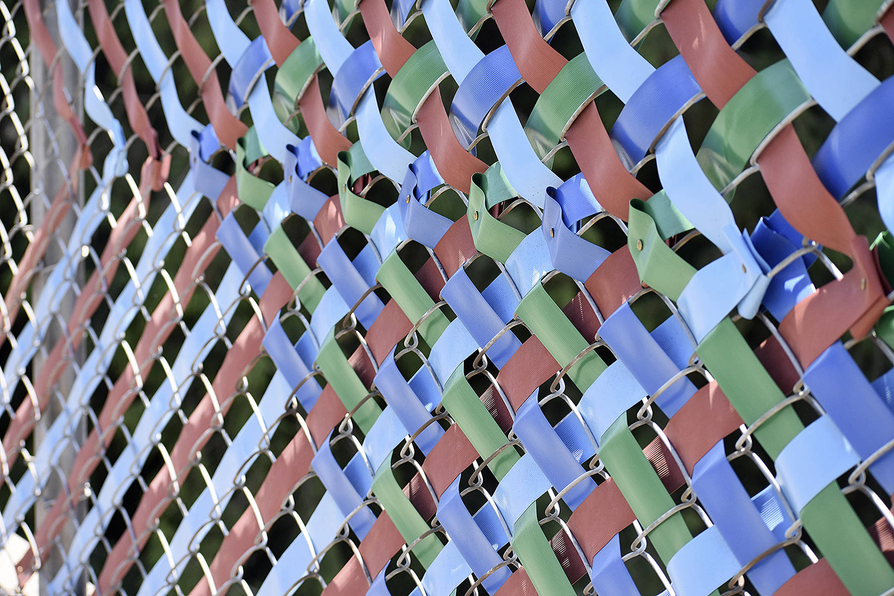 As the symbols were designed, volunteers worked long hours for a month weaving the colored privacy tape throughout the stretch of fence.