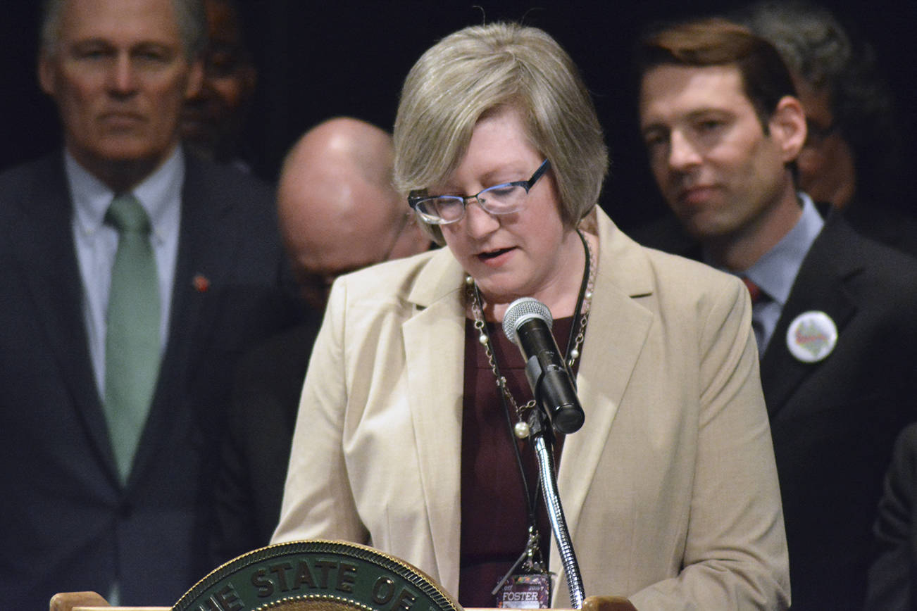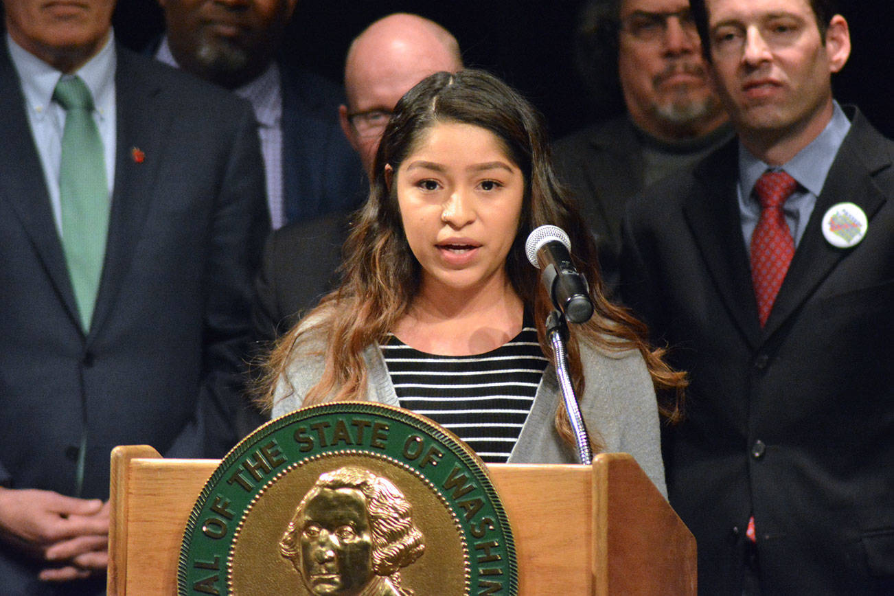 Inslee signed House Bill 2595 (automatic voter registration), House Bill 1513 (youth voter pre-registration), House Bill 2406 (improved election security and auditing) and other bills at Foster High School.