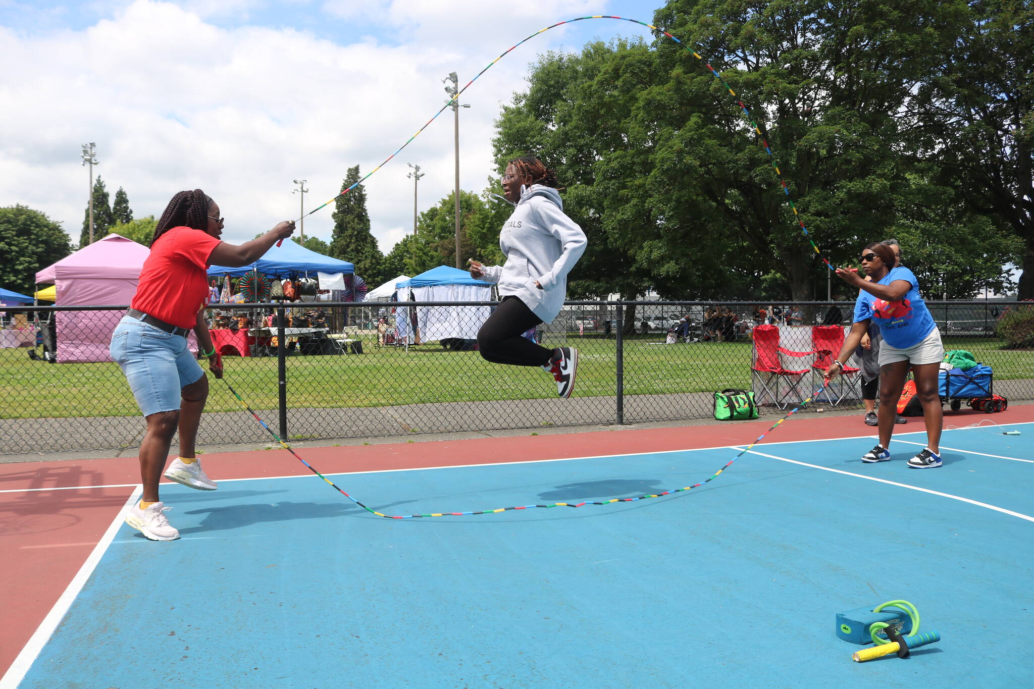 Along with local vendors, artists and artisans, Seattle’s Double Dutch Divas set up jump rope and hula hoop activities at the park’s basketball court, encouraging Juneteenth guests to learn how to play double dutch and get active.