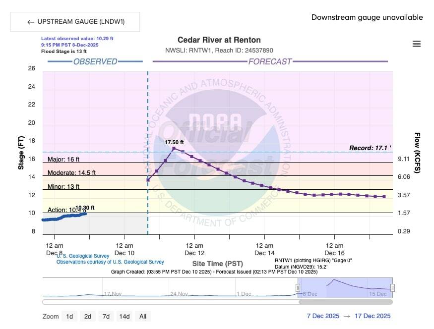 Projections show that flooding along the Cedar River may beat a 35-year-old record by 10 a.m. Dec. 11. Screenshot of National Oceanic and Atmospheric Administration Cedar River at Renton website page at 3:56 p.m. Wednesday, Dec. 10.