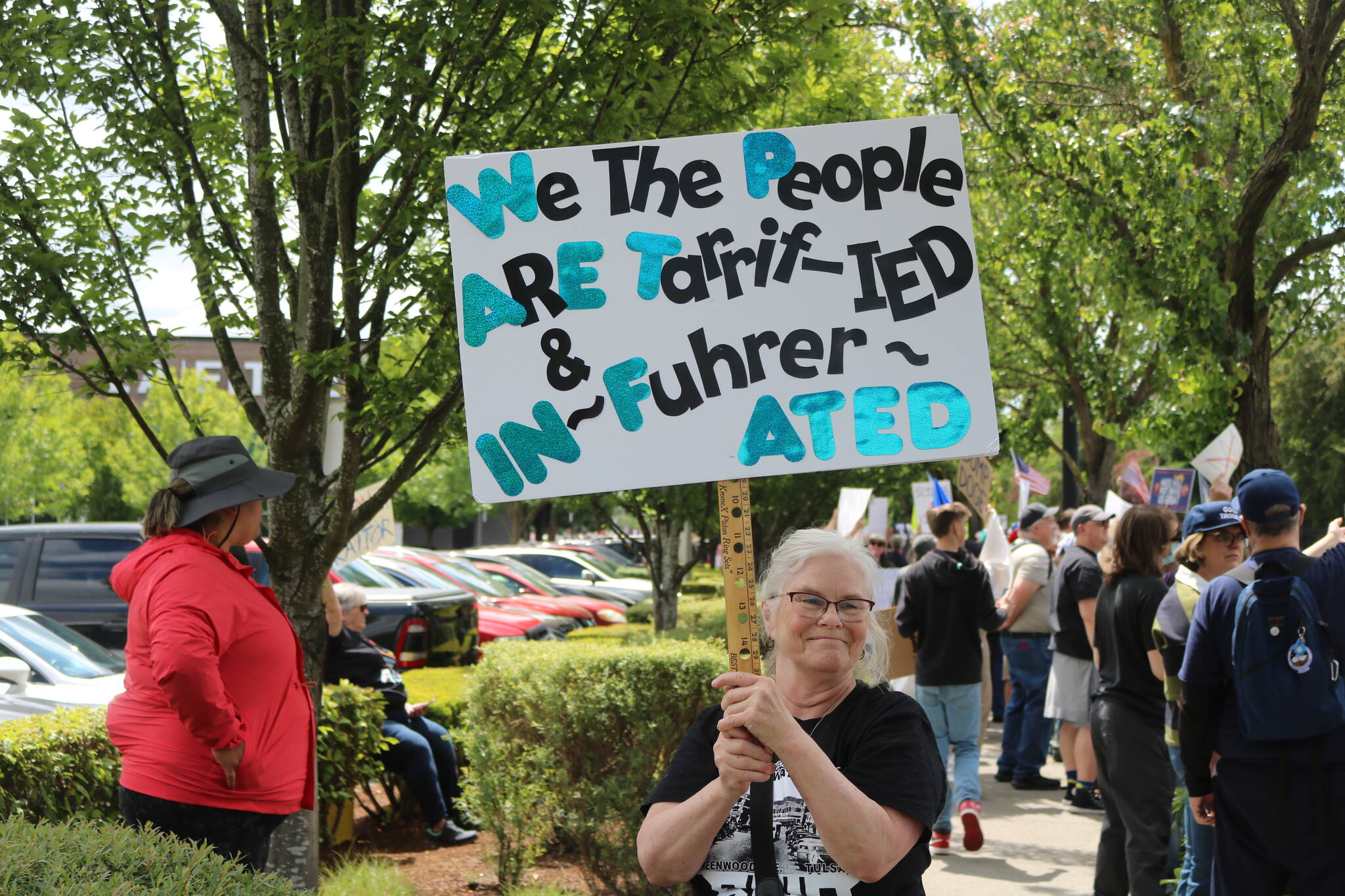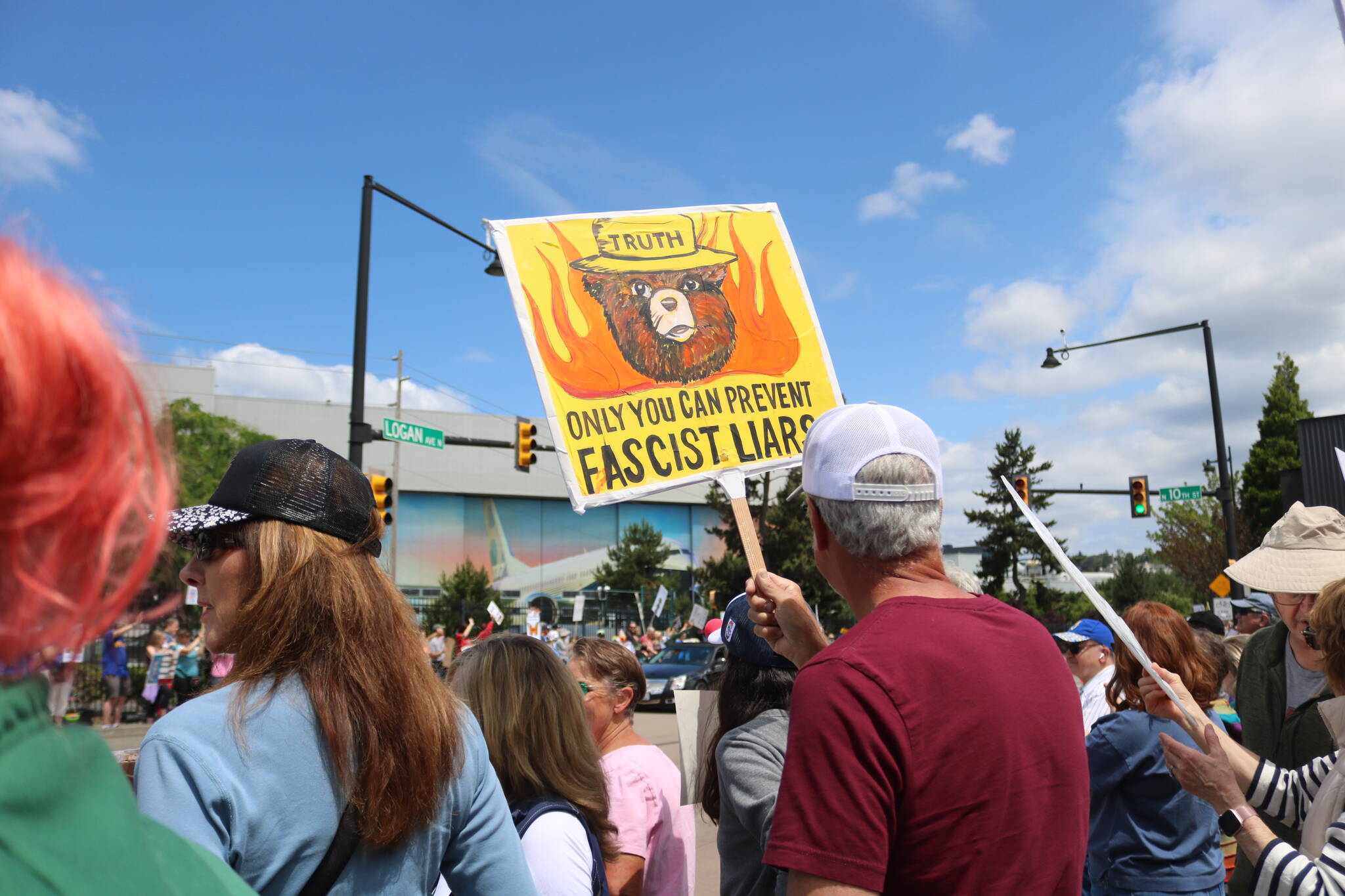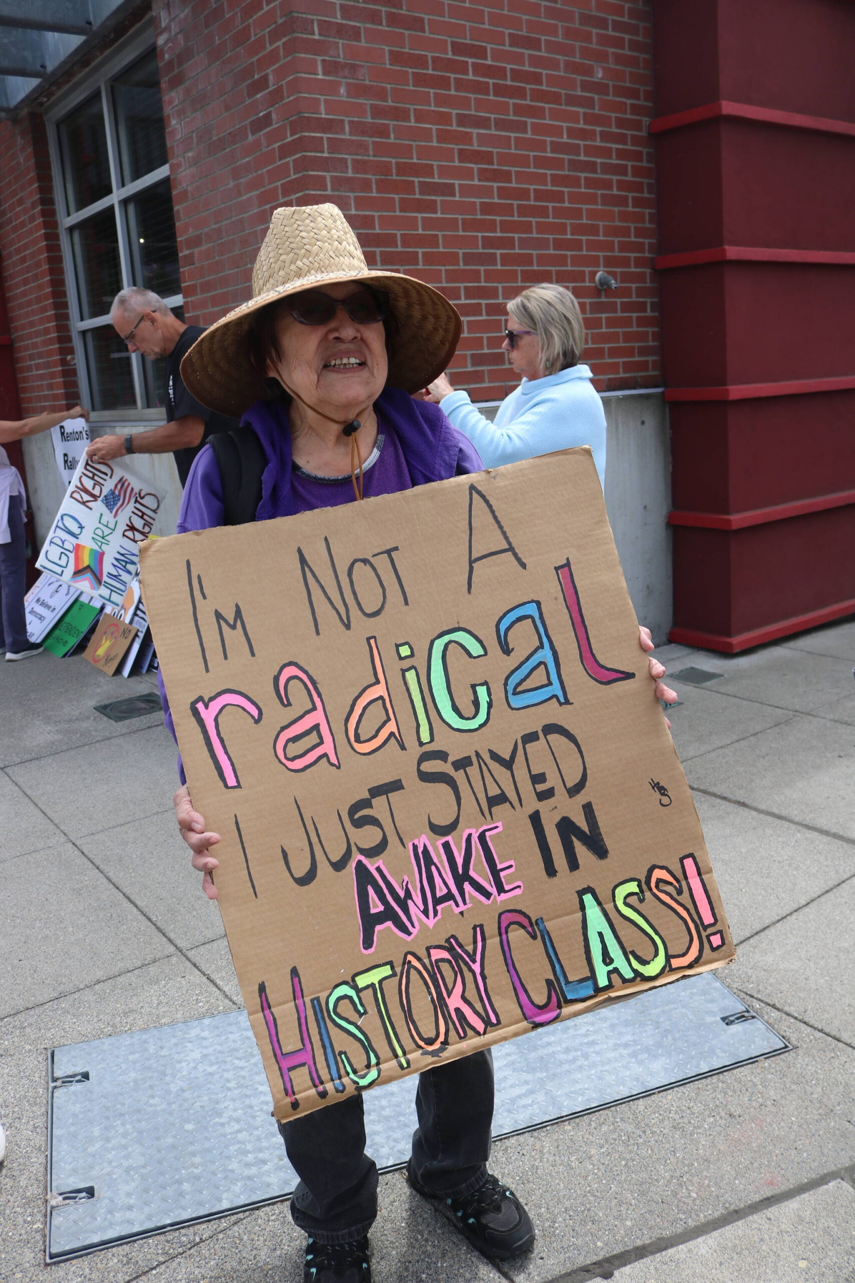 “I went to ‘Hands Off’ in April and I’m here today because of all the horrendous things that are happening right now, at universities and with immigrants… everybody is touched in a pretty big way,” said Taletta Wibmer of Renton, who is also concerned for how the administration’s actions will affect her grandchildren. “I have disabled grandkids and there is no money for research or support for their lives. They have us now, but what happens when we die? Who will support them?”