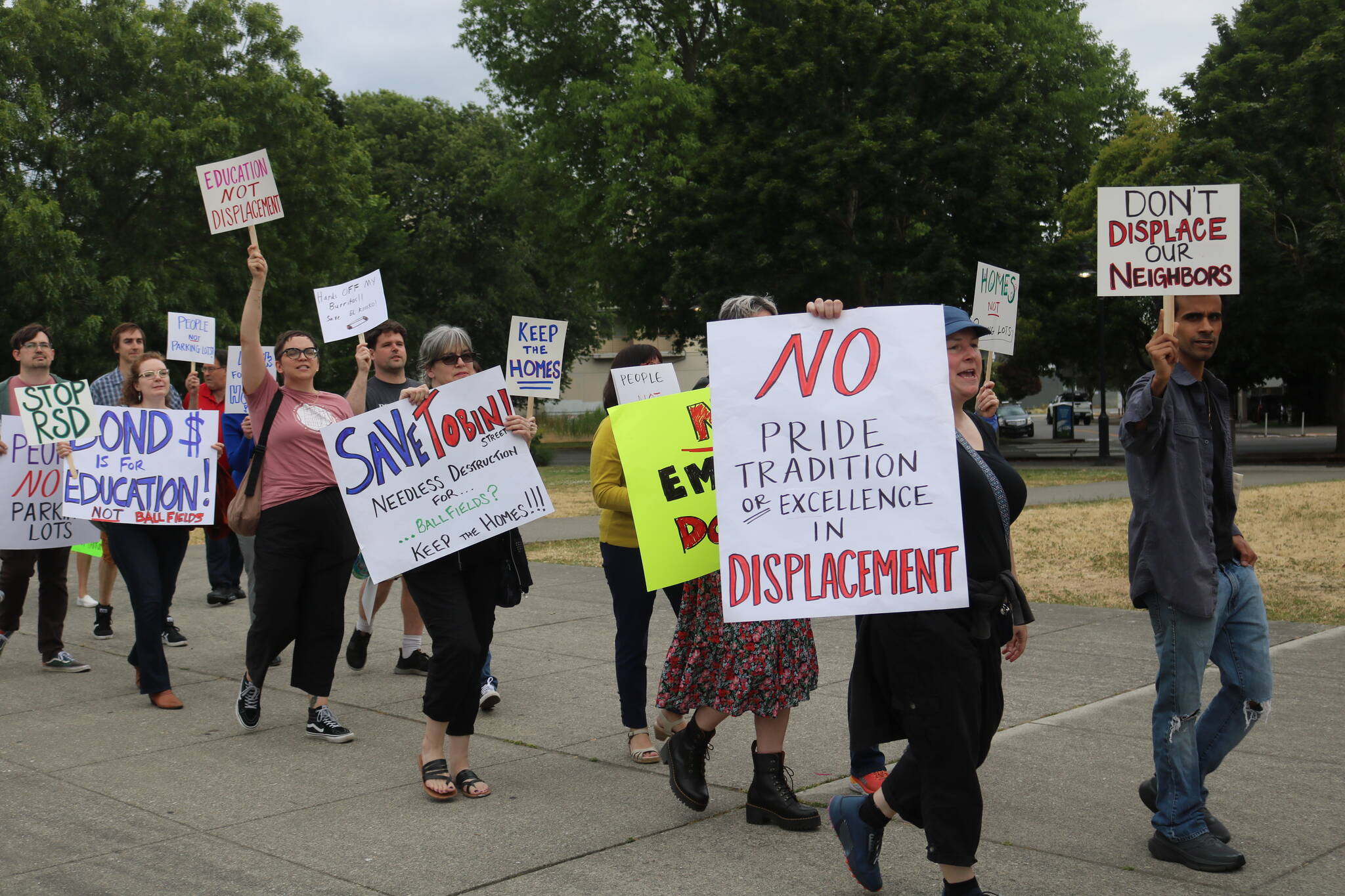 Over 30 protesters were present, carrying signs that read, “Honk if you support people not parking lots,” “Stop the Waste RSD” and “Save Catherine’s home!!!” One protester named Angie Laulainen said that she was there to support her friend Catherine Ploue-Smith.