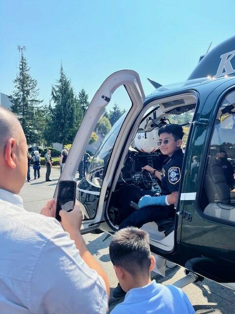 Ino, who will be 12 in November, rode as a VIP in a convertible during the July 26 Seafair Torchlight Parade and got to experience the SPD tour on Aug. 13, where Ino and his family were able to meet the SPD K9 unit, motorcycles from the traffic unit and the Quartermaster facility, and take a visit to the SPD Photo Lab, where they were treated to a family portrait. To finish off the day, Ino got to ride along on one of the SPD Harbor Unit’s boats. Ino said that his favorite part of the day was getting sworn in, going inside a real police helicopter, and then getting to see it fly off.