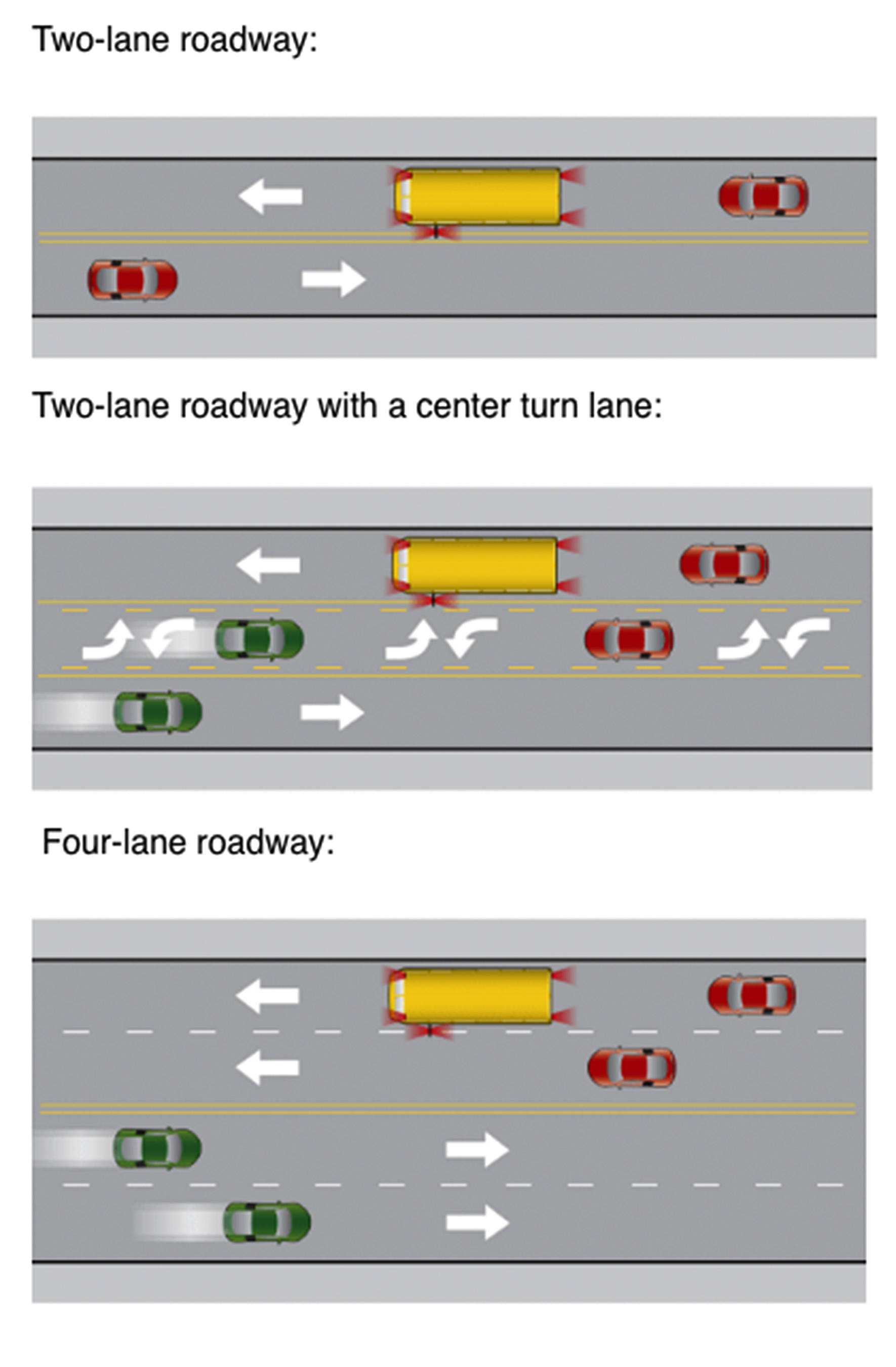 School bus safety laws state that a vehicle cannot pass a bus when the stop paddle and cross bar are engaged, and its red lights flash. The only exception is on roads with three or more lanes of traffic or a divided roadway. In those situations, only lanes going the same direction as the bus are required to stop.