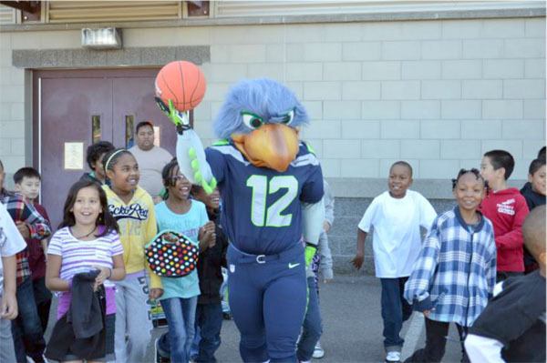 The trip to the school was part of the National Football League’s Play 60 program. Byron Maxwell, a second-year cornerback joined Blitz, the Seahawks’ mascot, to present students with positive messages about doing well in school, and tips and encouragement on playing outside for at least 60 minutes each day.The Seahawks representatives joined students on the playground for activities.