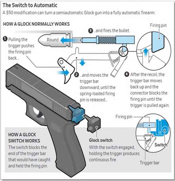 According to the lawsuit, Glock pistols are converted to shoot rapidly through the installation of an auto sear, commonly referred to as “Glock switches” or a “switch,” that can cost less than $50. Switches are often 3D-printed or imported and can easily be installed.