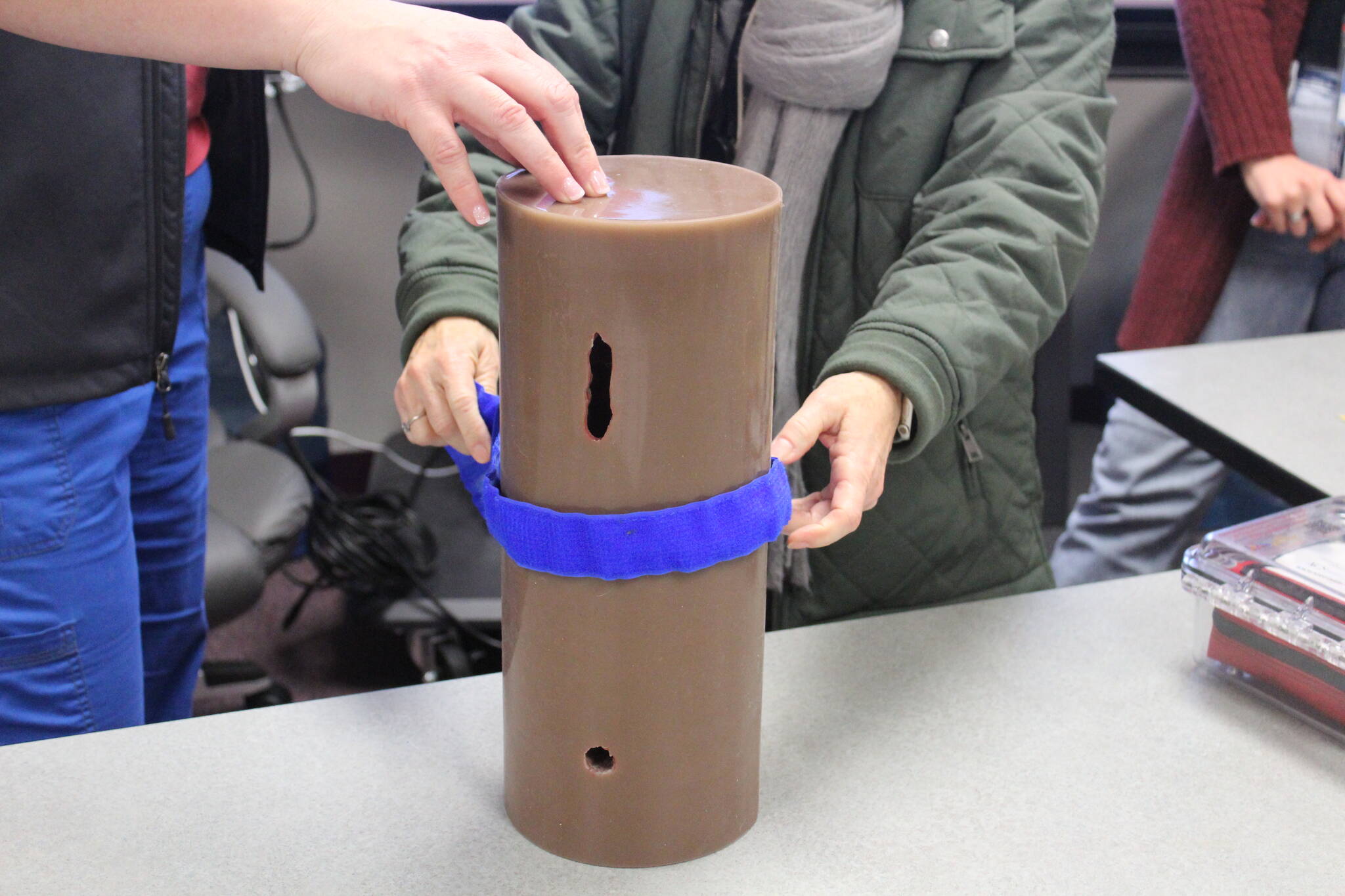 Once the presentation was finished, Bryn Mawr staff were then able to practice on various models with various wounds. This included deep cuts from yoga blocks that Bendickson and her children had made, life-like boxes with varying depths of puncture wounds, a practice block with a stick poking out of it, two leg dummies used for practicing using the tourniquets, and a “wet wound” tourniquet station over the sink where staff could practice putting on a tourniquet while hypothetical blood could be spurting.