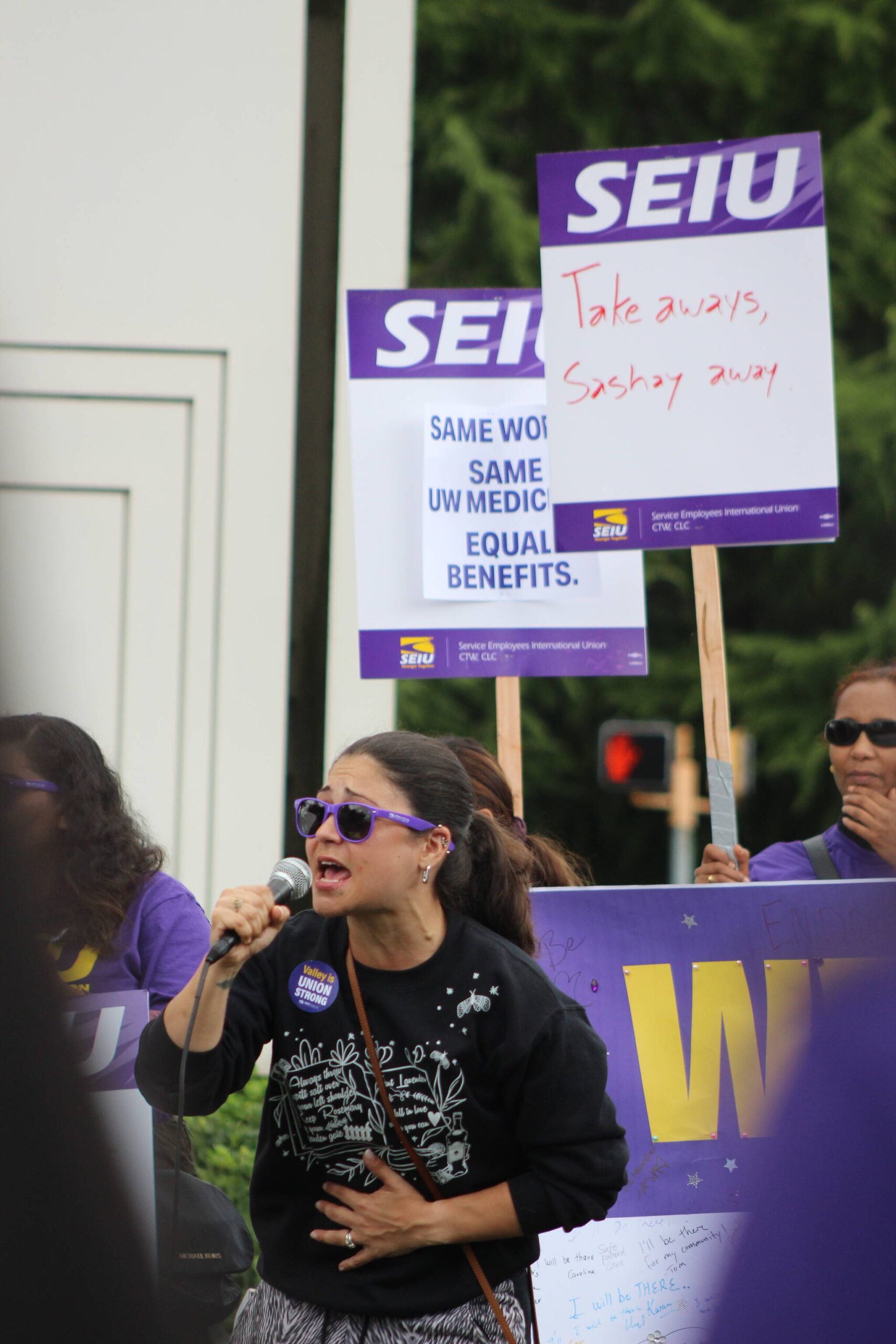 Around 1 p.m., several speeches were made by union members and local politicians, including Renton City Councilmembers Kim-Khánh Văn and Carmen Rivera, and Washington State Rep. Mia Gregerson of the 33rd District. Some speakers were executive board members of 1199NW like Swedish Issaquah RN Carol Lightle, Harborview Respiratory Therapist Neeru Kaur and Harborview RN Meni Tale. Erin Adamson of Office and Professional Employees International Union (OPEIU) and 1199NW President and RN Jane Hopkins also spoke to the crowd.