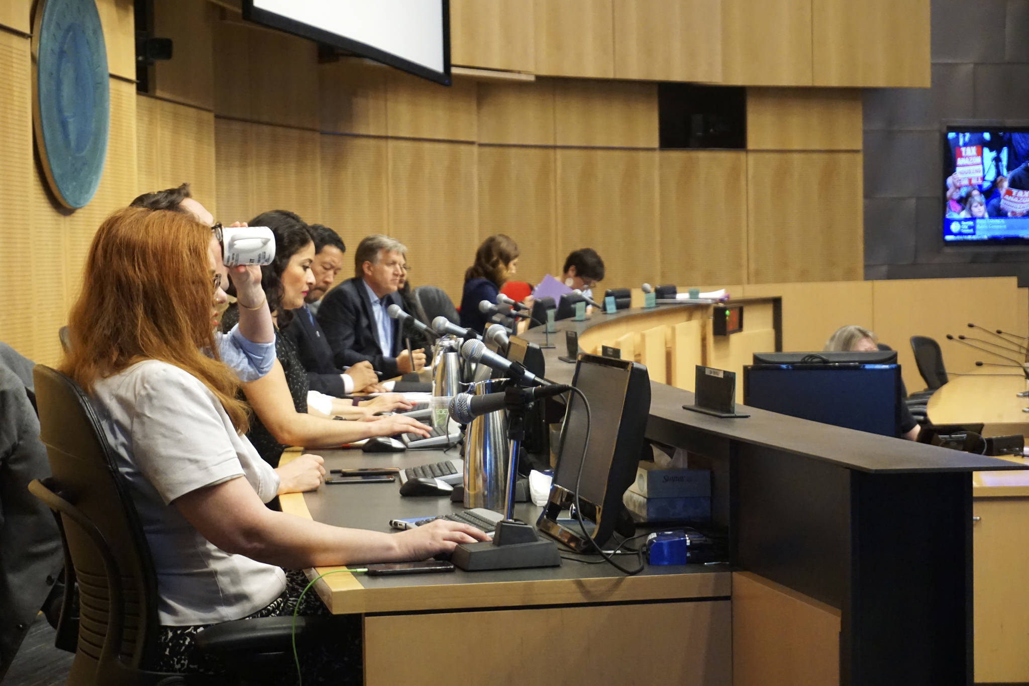 City Hall bustled with activity on Tuesday afternoon as people filed into the chambers to voice their opinions on the head tax repeal. Stationed in the lobby throughout the meeting, a Real Change member hit a gong 6,320 times to represent the number of people sleeping outside in King County. The county’s latest annual point-in-time count released in May revealed that 12,112 people are experiencing homelessness, a four percent increase from last year. Members of the public who opposed the repeal sang the refrain, “Everbody’s got a right to live,” as people filed up the stairs, filling every corner of the chamber. The room was divided by No Tax on Jobs supporters who held white signs seated on the left, and those on the right side who waved red signs in opposition that read: “Tax Amazon/Not Working People.”