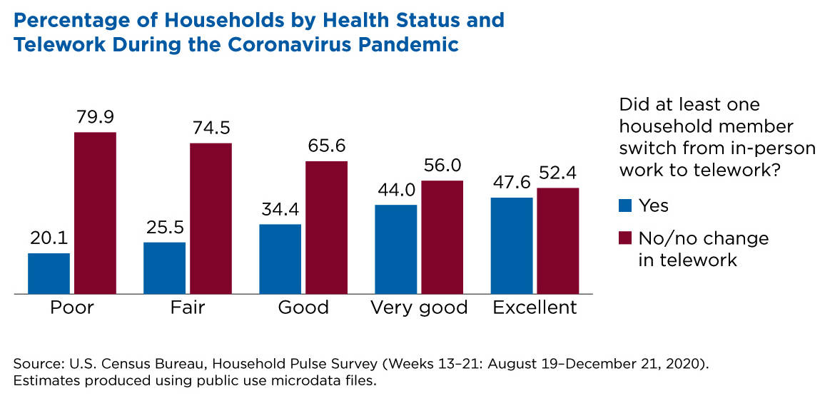 When asked to rate their health (as excellent, very good, good, fair or poor), those who reported excellent health were more than twice as likely as those who reported poor health to have had an adult in their household substitute in-person work for telework (47.6% versus 20.1%, respectively).