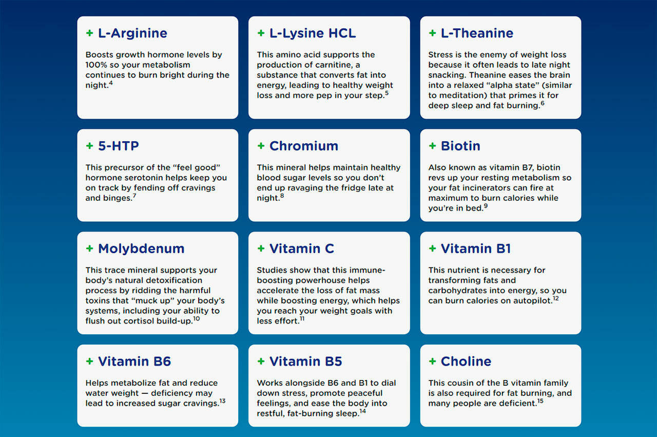 PhenQ PM contains all-natural ingredients that boost your fat-burning mechanism while sleeping. The blend of ingredients includes vitamins, minerals, amino acids, herb extracts, and nutrients backed by scientific research. Here are the active components of PhenQ PM and their benefits: