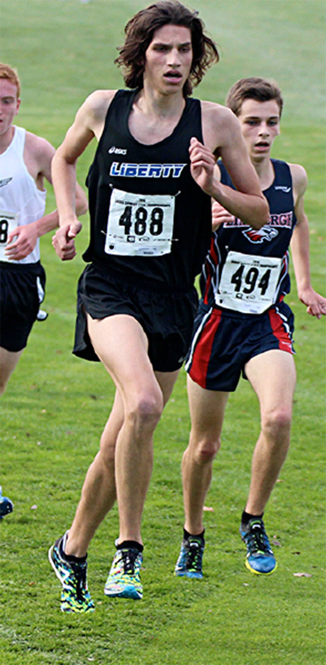 Below left, Hazen’s Shanon Gifford was the top Highlander finisher. Liberty’s Jake Knoblich and Lindbergh’s Tyler Hughey race toward the finish and Renton’s Kelis Barton, right, makes her way through the course.