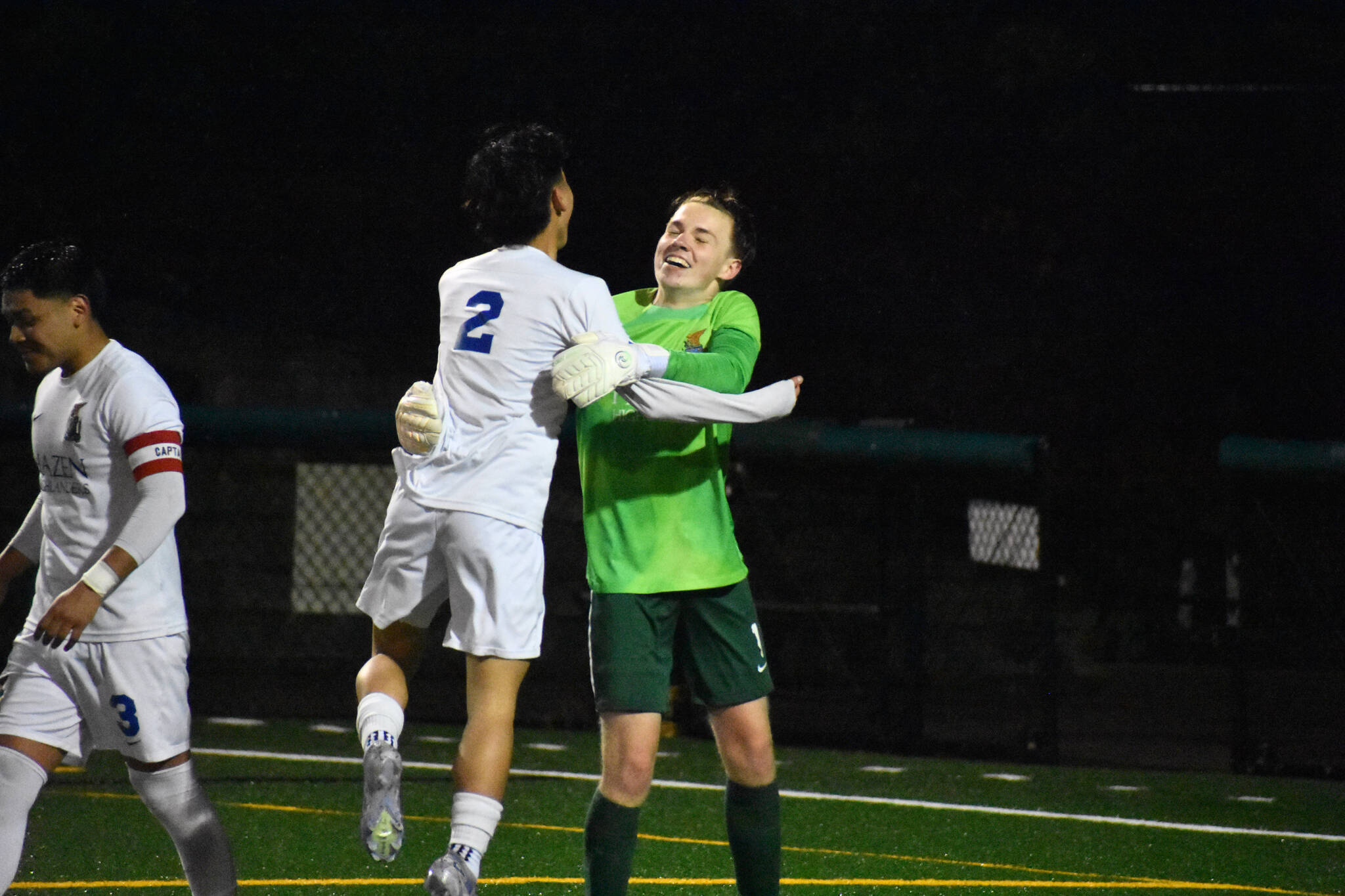 Goalkeeper Owen Pruitt celebrates the win with defender Jayden Pham at Pop Keeney Field. Ben Ray / The Reporter