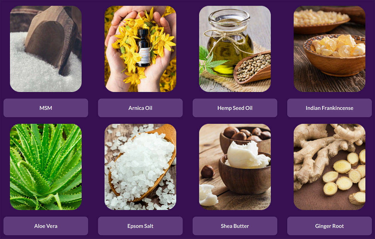 Primary Ingredients: MSM, Arnica Oil, Hemp Seed Oil, Indian Frankincense, Aloe Vera, Epsom Salt, Shea Butter, Ginger Root